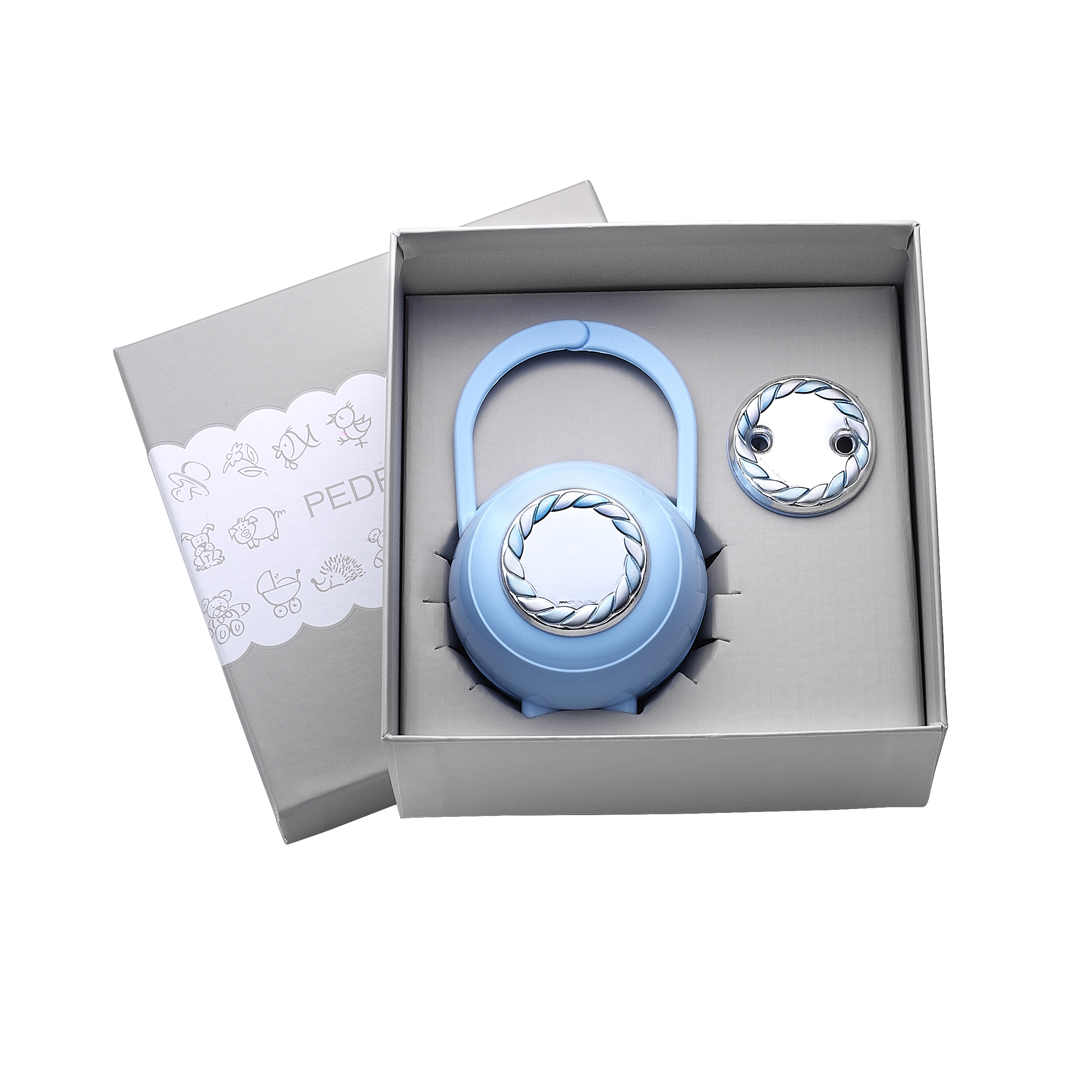 Set Treccia, porta chupetes + pinza, detalle de esmalte azul
