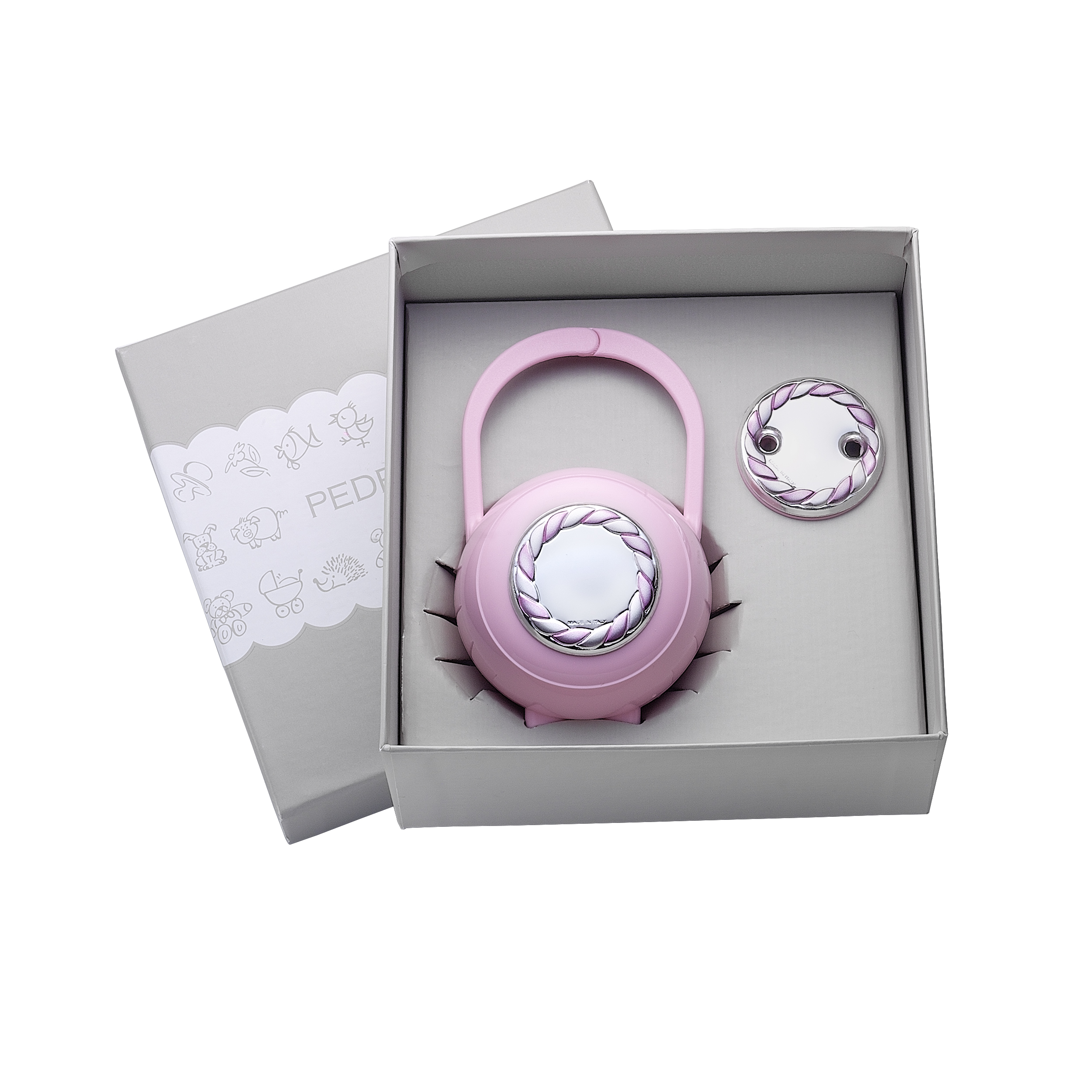 Set Treccia, porta chupetes + pinza, detalle de esmalte rosa